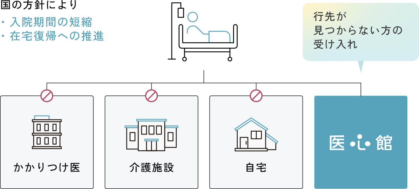 こうした現状から、急性期病院が本来の役割に集中できるよう、医療依存度の高い方の受け入れ先となり、地域の医療機関と連携しながら切れ目のないケアを提供するための場所として、医心館は生まれました。