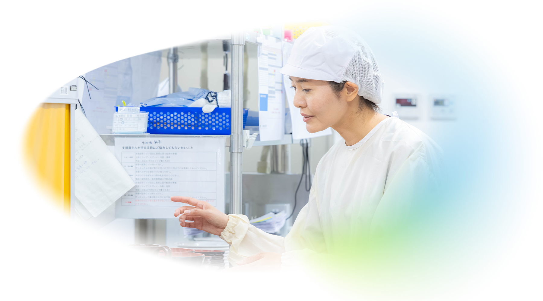 決まった時間帯での調理補助業務と、その他時間での清掃業務、療養環境の整備を担当していただきます。